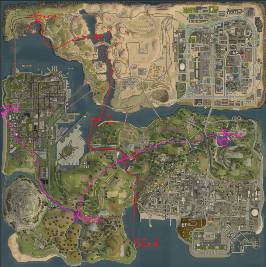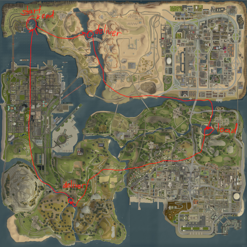 The first mission I made in DYOM was a supply route Skimmer mission. I had the idea of roleplaying in the form of “loading” supplies from well connected areas and “delivering” them to remote ones. There’s a big problem with this approach that I’ll go into later. The flight path would look like this: