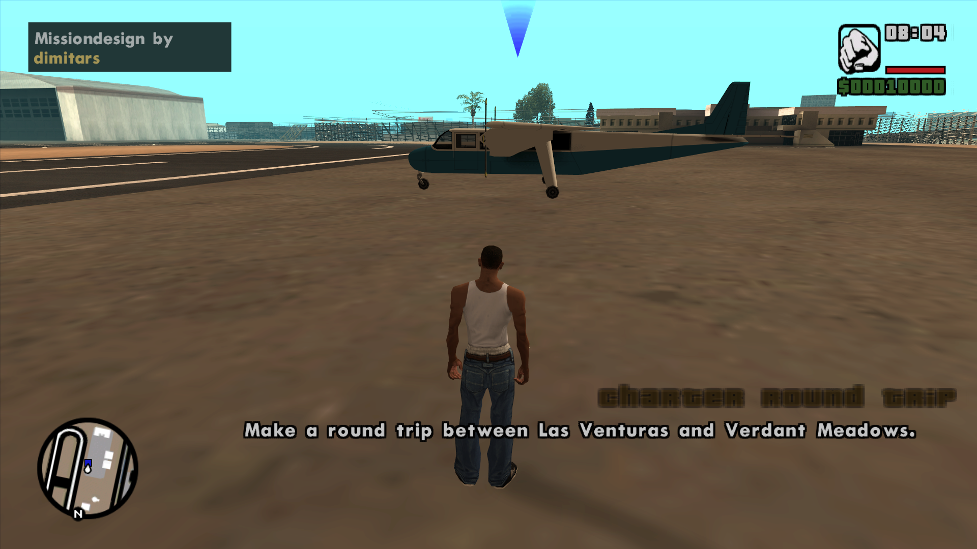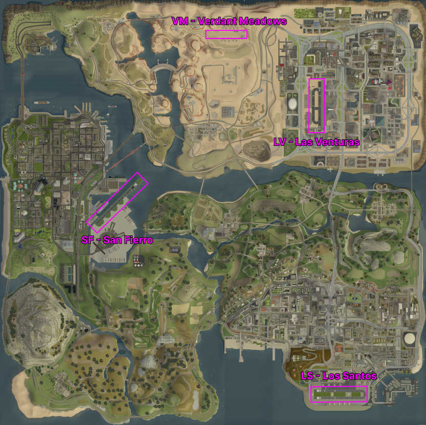 SF -> LV -> LS, named “San Andreas regional”. Besides landing on the airfield, the player has to taxi to drop-off points. - A very difficult AT-400 mission named “Cost saving”, where the player starts at the LS airport and has to collect passengers from SF and LV, and then drop them off at VM. The player then has to return the plane back to LS. The weather is foggy with no visibility and the plane is damaged from the start.
