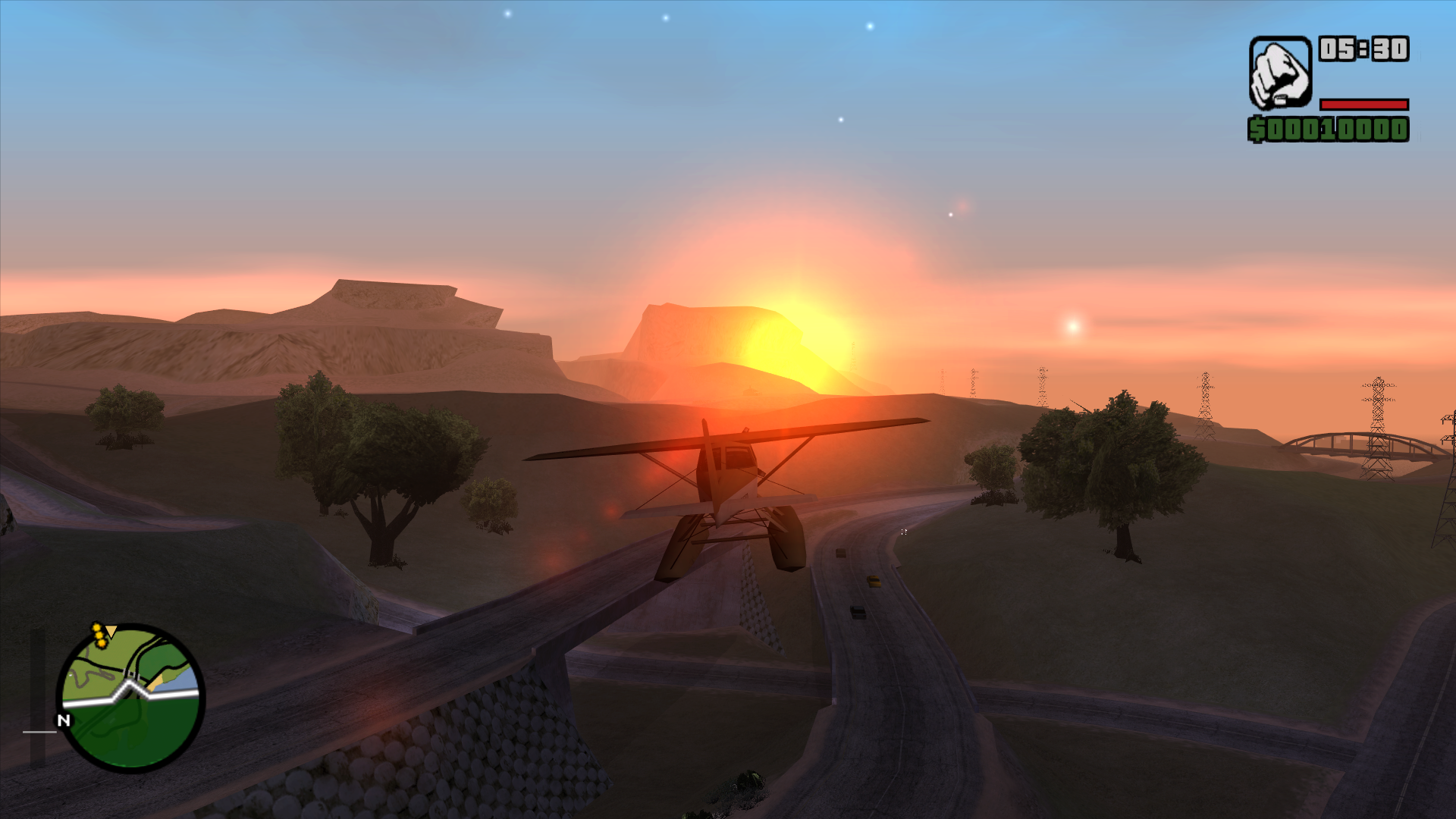 The mission is hard-coded to start at 5AM and have clear weather, so the rising sun looks really nice.