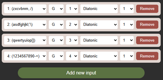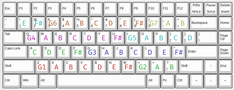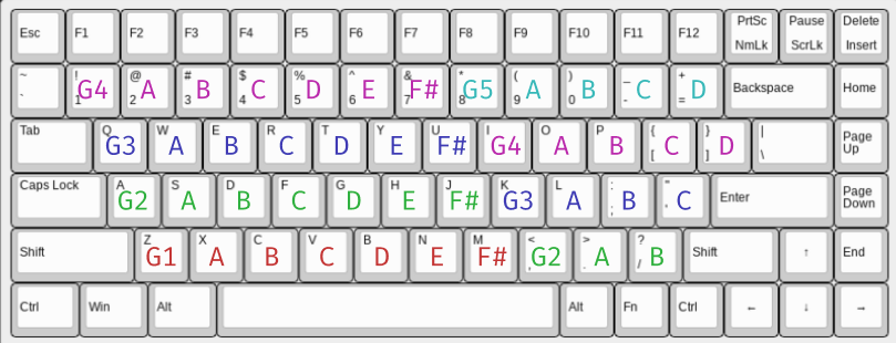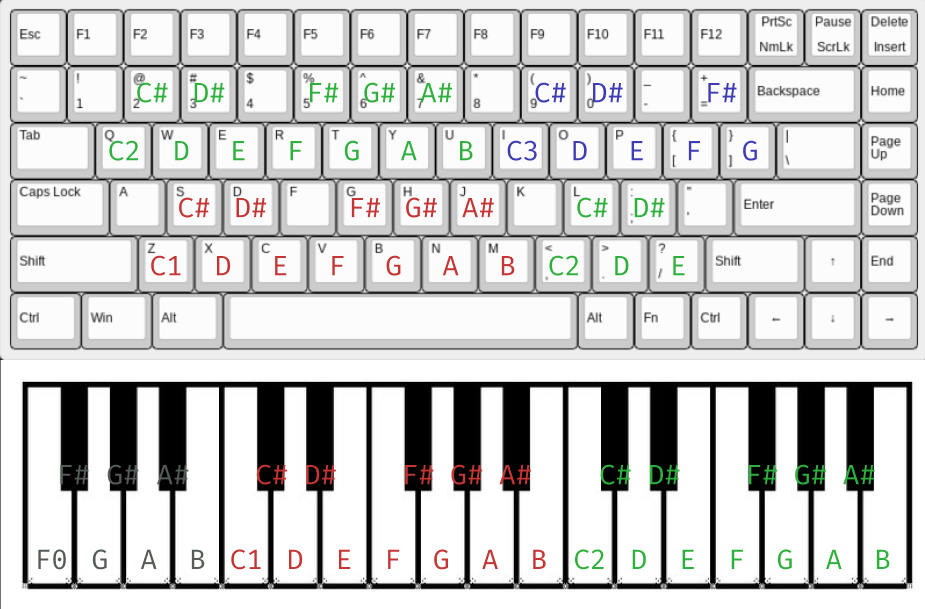 - The input keys determine which keys are used to play notes. In the example above, these are all of the keys in the first row of letters, just above the space bar.