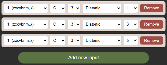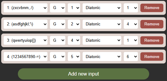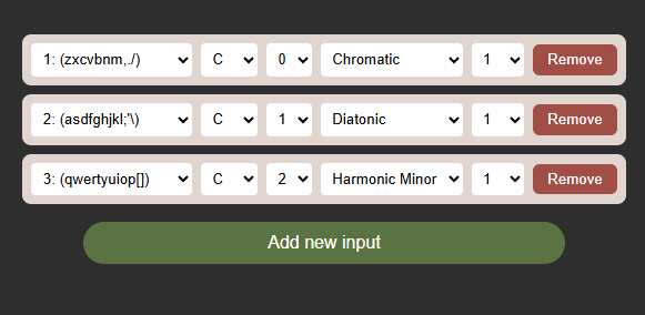 The app looks like this and is accessible at https://piano.dimitars.dev/. It consists of multiple input rows and a button for adding a new input. In the example above, there are 3 input rows.