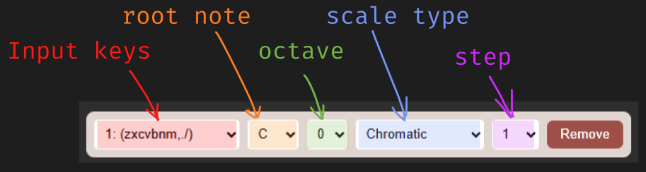 For a long time I’ve disliked the traditional way of simulating a synth/piano keyboard on a computer. Using the bottom row of letters for white keys and the ones above them as black wastes a lot of potential space for additional notes, leading to a very limited octave range. Not to mention that usually if a song is played in a specific scale, not even all the notes will be used.