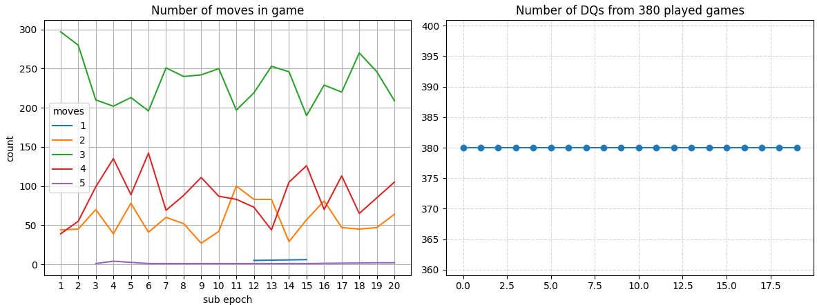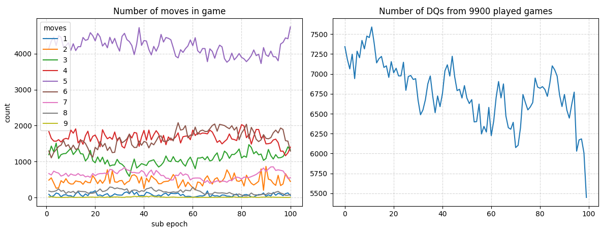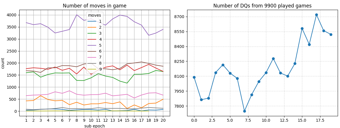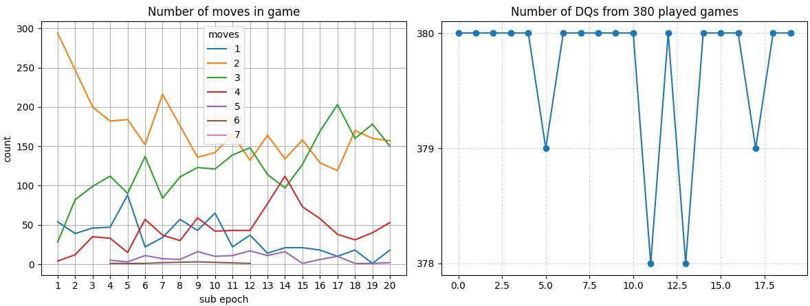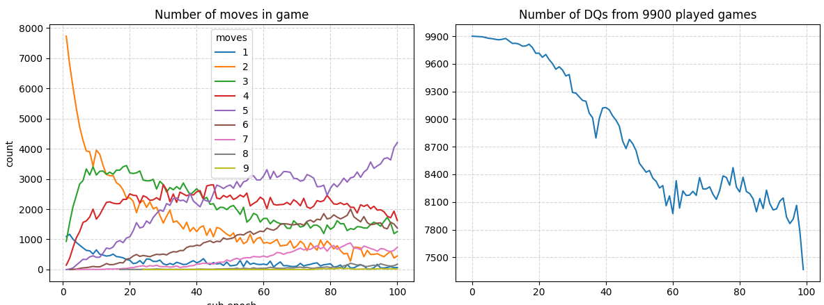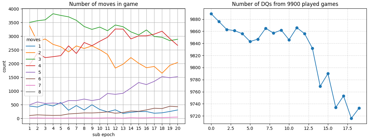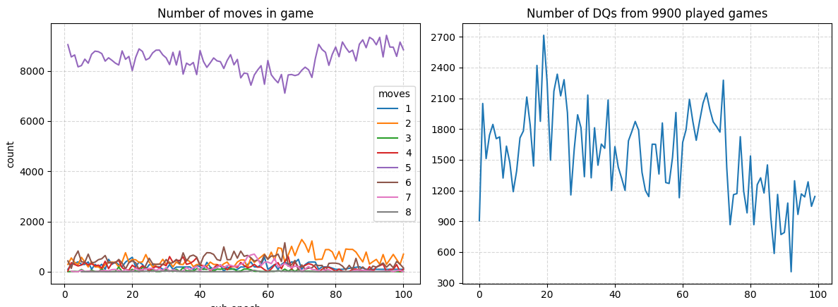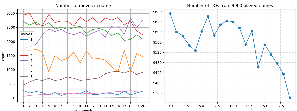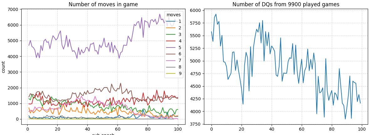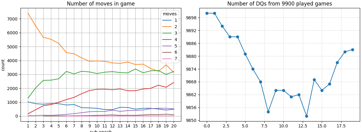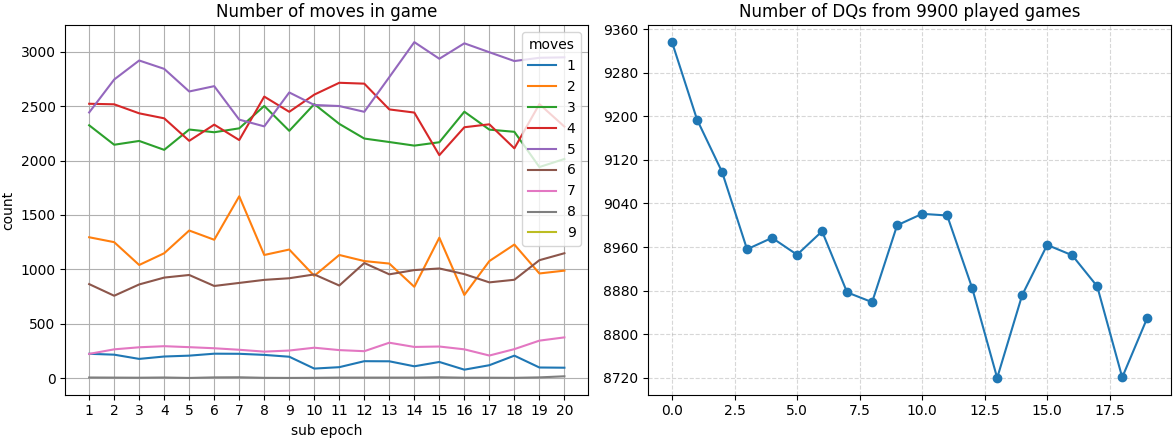 After 100 epochs, most games have 3 moves, and there are a lot of games that reach 4. There’s not much improvement as a whole, however. We can also see that all games ended in DQ for the last 20 epochs. That’s not good performance.