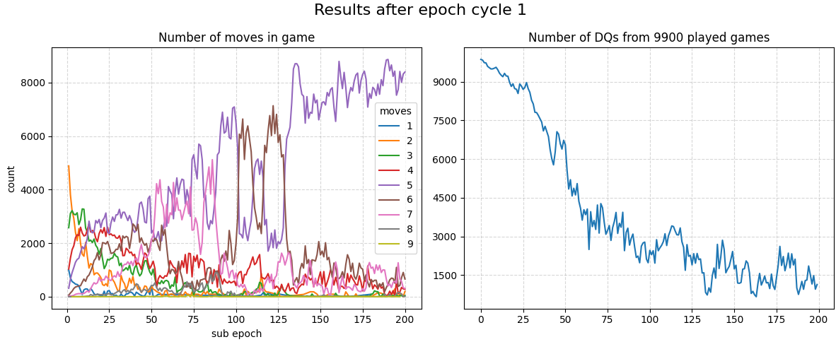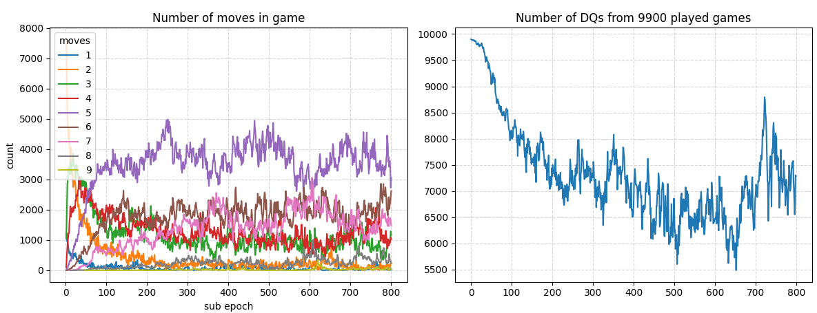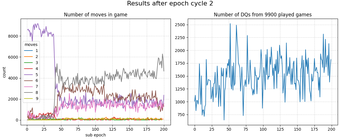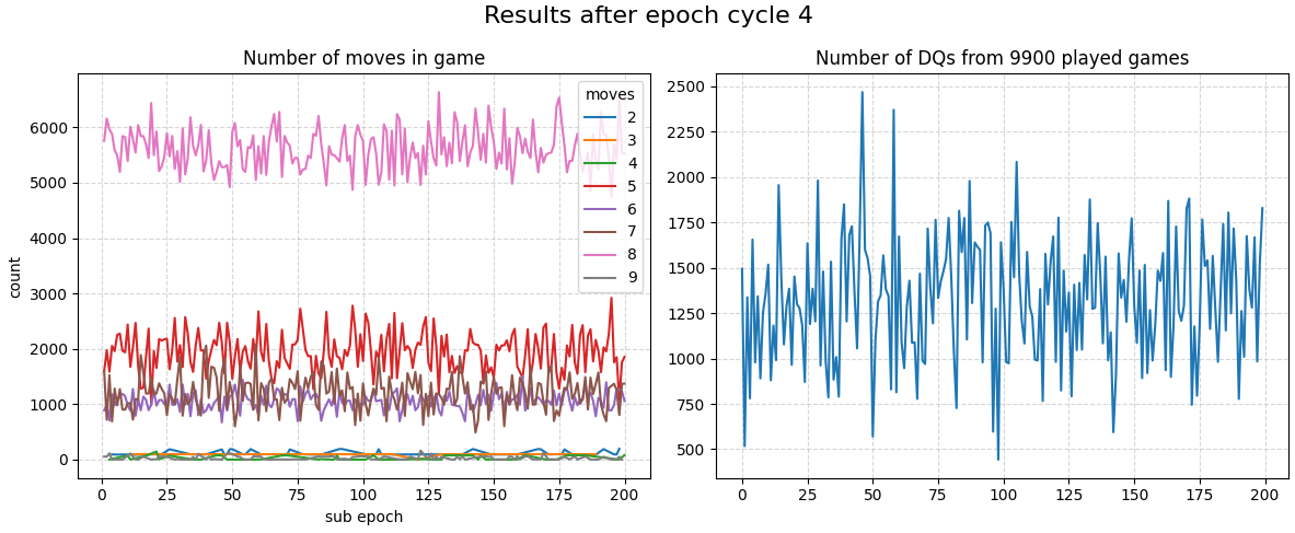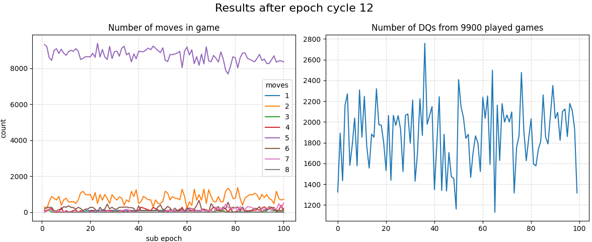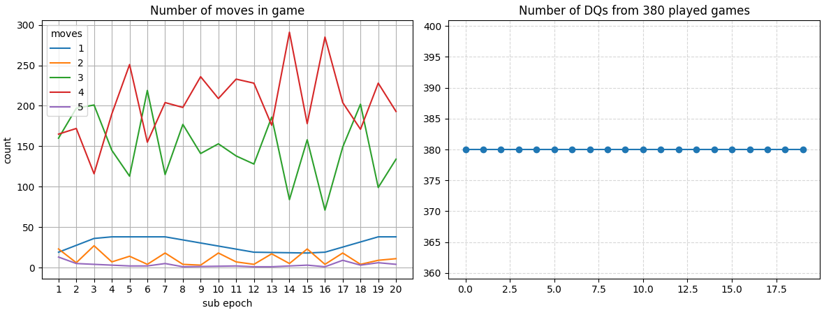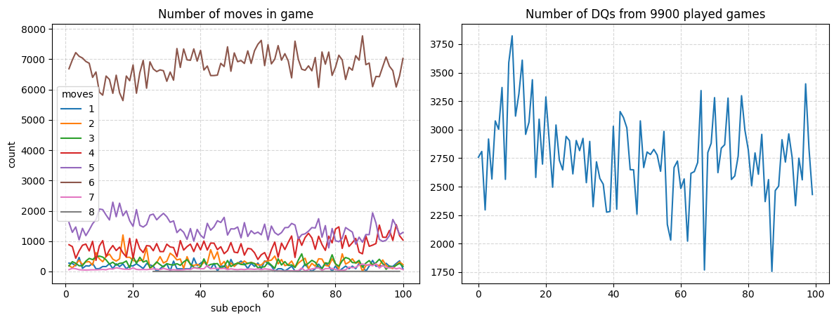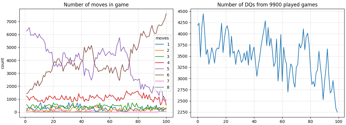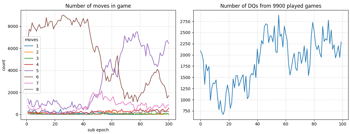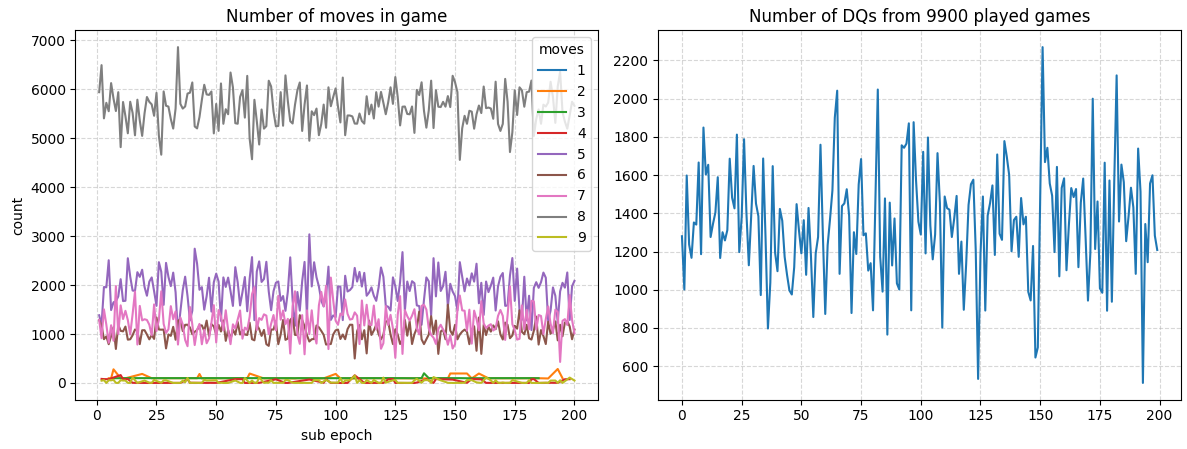 After 100 epochs, most games have 3 moves, and there are a lot of games that reach 4. There’s not much improvement as a whole, however. We can also see that all games ended in DQ for the last 20 epochs. That’s not good performance.